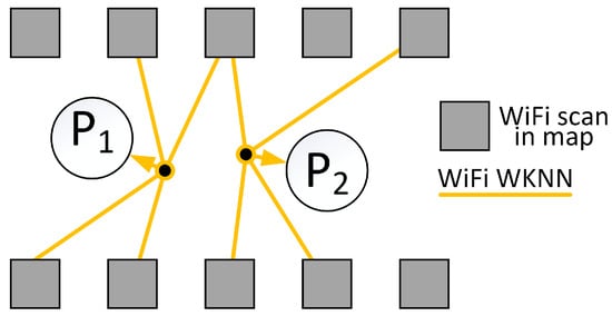 To compute the absolute location from the matching of fingerprints we employ the WKNN approach [], which proved to be reliable in a number of other positioning systems [,]. At first, WKNN finds the k most similar scans applying the chosen similarity norm s. We consider matches between scans only if at least of WiFi networks are found in both of scans. Then, the user position , related to the recently obtained WiFi scan is determined as a weighted average of the positions of these k scans:
