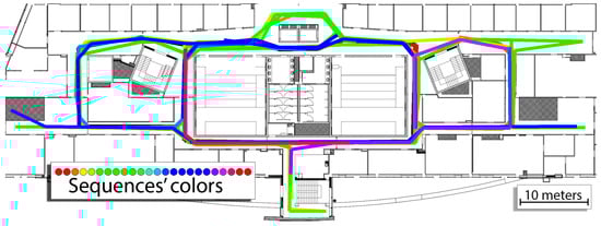 The experiments were conducted on the third floor of the Centre of Mechatronics, Biomechanics, and Nanoengineering at Poznan University of Technology. The building has multiple corridors that can be used to access laboratories and lecture halls. In our experiments, we recorded 24 sequences that users would usually make to access these rooms that varied when it comes to the length. Two people were involved in recording the sequences: one responsible for recording 19 sequences and another one that recorded 5 sequences. We used a Sony Xperia Z3 smartphone to capture WiFi, accelerometer and orientation data for further processing. The detailed lengths of the sequences are presented in Table 1. The total distance covered by the sequences according to the ground-truth information is equal to approx. 1565 m. During these sequences, 346 WiFi scans were recorded to support indoor localization. The ground-truth information was obtained from users that annotated the covered paths on the prepared map of the building. The ground-truth routes are presented in Figure 7.
