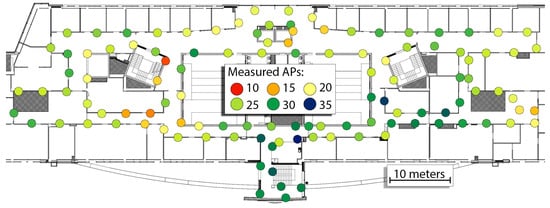 In this research, we assumed that an a priori map of WiFi fingerprints is available for the environment. Hence, we recorded WiFi fingerprints along the walls of the corridors. The scans were recorded in-motion along the assumed route with constant walking speed. The dynamic capture procedure was preferred to the static recordings, as it makes possible to quickly capture the required WiFi map, despite being slightly less accurate than the static acquisition approach. The number of APs is based on the number of different measurements in the scans and measurements at 2.4 GHz and 5 GHz from the same APs are treated as independent measurements. The recorded WiFi map consists of 114 scans, and the average number of APs per scan (i.e., user position) is equal to 21.91, but varies per location. The minimum number of APs visible in one location is equal to 10 while the maximum number is equal to 31. The locations with known WiFi scans along with the recorded number of distinct APs in each location are presented in Figure 8.