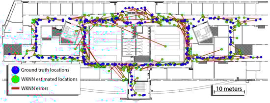 Currently, the most widely applied fingerprinting-based positioning technique is Weighted k-Nearest Neighbor (WKNN) []. This relatively simple method selects k most similar fingerprints from the pre-surveyed database describing the environment and computes the user position as a weighted average of the positions of these fingerprints. Weights are related to the similarity between the matched fingerprints. A drawback of this technique is the need to manually tune its parameters for the given environment. Although attempts to develop WiFi-based indoor positioning algorithms that require a minimum effort at the design stage, for example by employing end-to-end machine learning [], have been presented in the literature, the achieved localization accuracy is not much improved with respect to WKNN.