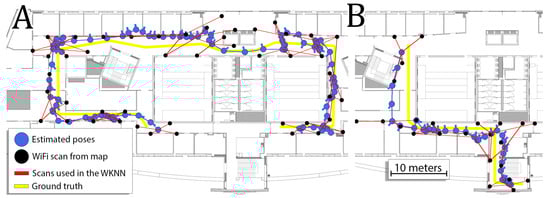 The performance of the system on two exemplary sequences is presented in Figure 10. Each blue circle represents one estimated user location that is connected to the next node using a blue edge that represents the PDR estimate. Each black circle represents the location with WiFi scan stored in the map that was utilized at least one time for the WiFi WKNN estimation. The WiFi WKNN estimation is represented by joining the user location with four locations of the scans stored in the map using red lines. The weight of each connection in the WiFi WKNN is not shown in the figure. The ground-truth path is shown using yellow segments.