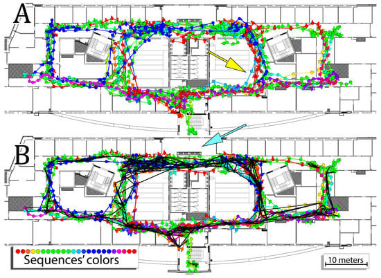 Comparison between trajectories obtained by separate (A) and joint (B) optimization of factor graphs built for all the 24 trajectories. The black lines in (B) represent constraints between poses belonging to trajectories of two different users that emerged by using the WiFi scans collected by the users in the WKNN procedure. Arrows point to areas best illustrating the specific behavior of the system that is explained in the text.