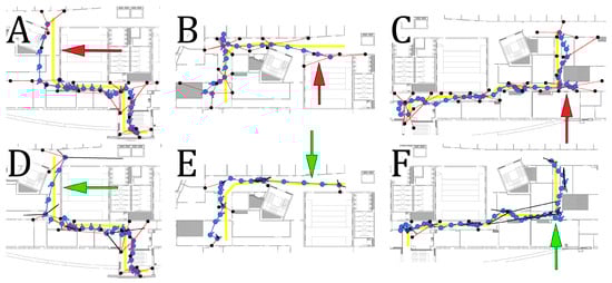 A visual comparison between individual trajectories obtained using separate and joint optimization on sequences 5, 18 and 22 can be observed in Figure 12. The performance on the sequence 5 is presented in Figure 12A,D. The lack of proper WiFi measurements and inaccurate orientation changes result in a localization estimate drifting outside of the corridor. This is undesirable as it can be seen clearly that the performance of the system is unsatisfactory for the users. When additional information from other trajectories is used, the WiFi WKNN estimate is more accurate, and the corresponding part of the graph is corrected and the final localization RMSE is reduced from 3.23 m to 1.85 m. A similar situation can be observed for sequence 18 presented in Figure 12B,E. The additional information from another trajectory results in more accurate WiFi WKNN estimation and a final reduction of localization RMSE from 6.54 m to 3.54 m. As a result, the user is no longer localized outside of the corridor and therefore it is possible to appropriately navigate the user to the destination. The last example of trajectories obtained on sequence 22 is presented in Figure 12C,F. The addition of information from other users makes it possible to correct the turn of the user trajectory despite inaccurate orientation estimation that suggested further movement in the same direction. In the case of sequence 22, the RMSE was reduced from 3.68 m to 1.05 m when joint optimization was used.