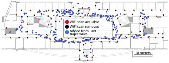 To perform these experiments we decided to reduce the size of the original WiFi map to contain from to of the originally stored scans. As the placement of these scans has a huge impact on the accuracy of the WiFi localization, we decided to randomly keep or remove the WiFi scans from the original map in order to achieve the wanted density of the WiFi map. An exemplary map containing half of the original WiFi scans is presented in Figure 13. As this randomness influences the results, we repeated the evaluation procedure 50 times for each configuration. As the optimization converges to a local minimum and is deterministic, the obtained average performance on these 50 trials is a good measure of the performance of the system on a reduced WiFi map. During these experiments, the WKNN parameters were not changed from the originally chosen ones.