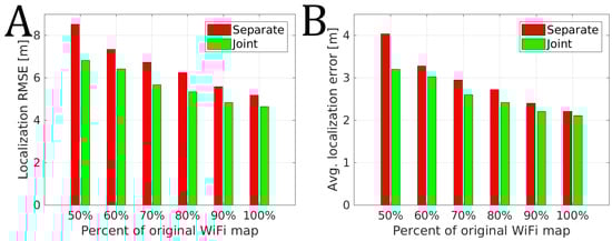 The RMSE (A) and average error (B) over 50 trials depending on the percent of the size of the original WiFi map when considering trajectories separately and with jointly in the graph-based optimization.