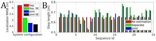 The localization RMSE obtained for all of the recorded sequences is presented in Figure 15A. The worst localization RMSE of 6.24 m was obtained when each trajectory was optimized separately and no step estimation was performed. The same system with step length estimation obtained a localization RMSE of 5.19 m, which is a significant improvement. When the trajectories were optimized jointly, the influence of step length estimation is smaller but visible with a reduction of RMSE from 4.76 m to the RMSE of 4.65 m when the step length estimation is turned on.