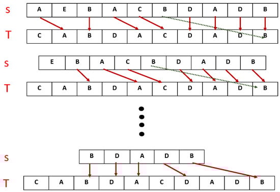 Dynamic Time Warping (DTW) approaches the problem by stretching the multivariate data sets with respect to time []. In addition, Principal Component Analysis (PCA)-based techniques have tried to overcome this problem by avoiding unnecessary components of the data sets []. A tightly coupled issue associated with traditional dynamic programming based algorithms is their time and space complexities. These algorithms match every element of sequence S with each element of sequence T as shown in Figure 1, i.e., matching first element, that is A, in S with last element of T, that is B, which is unrealistic. These comparisons are necessary for the creation of a similarity indexes table that is used to compute the longest common subsequence (LCSS). Additionally, if two sequences are exactly the same, dynamic programming based algorithms will still compute their similarity indexes table. Likewise, the major issues associated with DTW and PCA-based techniques are their sensitivity to outliers and information loss, respectively. Therefore, a robust algorithm is needed to solve multivariate problems and avoid the issues of existing algorithms, such as outliers, scalability and complexity. In this study, we present an efficient algorithm to measure the similarity indexes of multivariate time-series data sets using a non-metric based approach, which is preferred due to its non-sensitive nature to outliers, as described in Figure 1, where in this case. The proposed algorithm works by dividing the multivariate data sets into discrete univariate data sets and initiates the similarity indexes computation process with the first i.e., first column of multivariate data sets, as described in Figure 1, where . In this case, every element of data set S is matched with at most three elements of T and the matched elements, as depicted by red arrows, are stored with their location information. Additionally, the proposed algorithm uses sliding window control parameter () to bound or limit the matching space of data set-1 elements in data set-2 which saves both time and space by avoiding unnecessary comparisons as depicted by the green arrow (as an example). Our experimental results show that the proposed algorithm solves most of the issues associated with the aforementioned dynamic programming-based algorithms. The remainder of the paper is organised as follows.