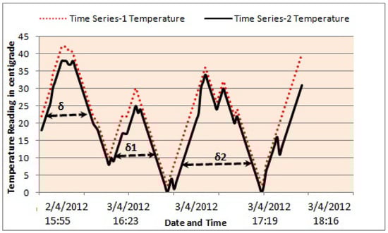 Every variable of a multivariate time series is treated as a univariate time series, that is, temperature, humidity and moisture represent different time series. The proposed algorithm works by finding the LCSS of the first variable, which is temperature in this case. The first temperature value of Table 1 (i.e., 35 C) is matched with every temperature value of Table 2 until a match is found or ends it or the end of the data sets are reached. Please note that is a sliding window control parameter that defines a specific window (i.e., a range of values to be considered for matching) for each element of time series/data set 1 (Table 1) in time series/data set 2 (Table 2), which is three in this case. The sliding window control parameter is an important aspect to be considered because matching of the first element/symbol of a sequence/time series/data set with the last element of another does not make any sense at all due to the fact that the problem under consideration requires finding the LCSS. The idea of the sliding window control parameter is described in Figure 2, where different values of this parameter are given and their selection from , and depends on the application and data set. A with a smaller value is selected if abrupt variations or fluctuations in data sets are occasionally encountered i.e., temperature reading collected through a sensor node. Conversely, a larger value is an ideal candidate or solution for multivariate data sets which have an extremely high variation or fluctuation ratio i.e., stock exchange data. The control parameter is helpful in reducing the total number of comparisons, in this case temperature value 35 C (Table 1), needed to find the matching element in Table 2. Traditional dynamic programming-based algorithms (as described in Section 2) compare a single value to all values of the second data set, which can be expensive or even inappropriate in real time. Our sliding window-based comparison technique, as described in Figure 2, limits the matching window to a particular value (i.e., the first value of Table 1 is matched with only three values of Table 2).