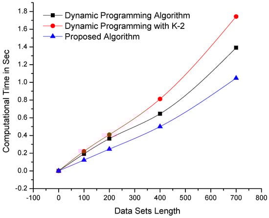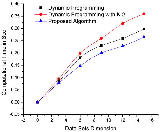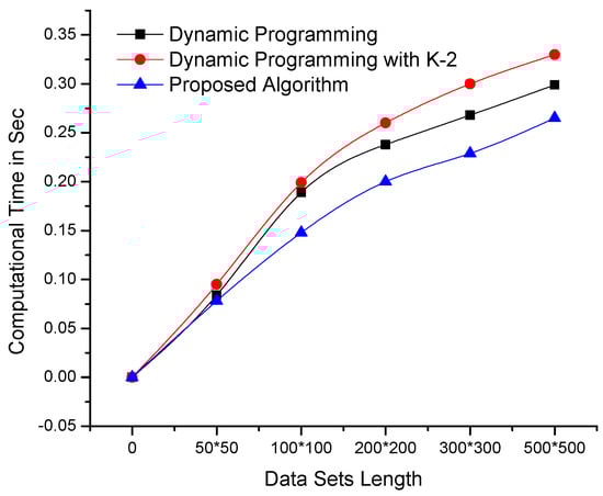 The algorithms were also tested on data sets with constant variables/dimensions and dynamic sizes/lengths. The results of testing are shown in Figure 4, which clearly depicts the remarkable performance of the proposed algorithm compared with its counterpart algorithms. Although dynamic programming-based algorithms are affected by an increase in data set length or dimensionality, our mechanism is consistent. The algorithms were further tested on larger data sets with more complex dimensionalities, as shown in Figure 5, as well as on data sets where the parameters of length and dimensionality were kept constant. The computational results presented in Figure 6 demonstrate that the proposed algorithm performs better than dynamic programming-based algorithms.
