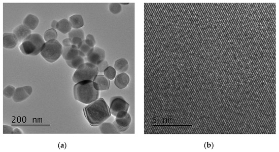 TEM images of the nanoparticles are presented in Figure 3. The synthesized nanoparticles are almost hexagonal in shape. The average crystallite size is about 50 nm, which is in agreement with the value indicated by XRD analysis. The lattice fringes as seen in the high resolution transmission electron microscopy HRTEM image (Figure 3b) indicate clearly the high crystallinity of the grains.