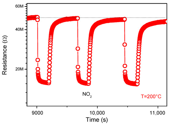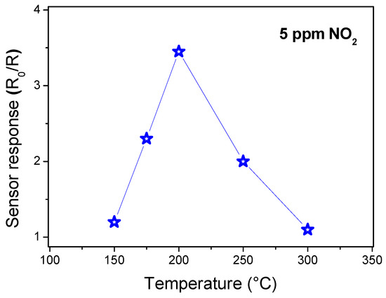 Before being exposed to the target gas, α-Fe2O3 sensor must reach a stable resistance, taken as R0. First, the optimal operating temperature of the sensors was evaluated. The operating temperature is an important parameter for a semiconductor metal oxide sensor as it determines the sensitivity of the device and can be used also to modulate the selectivity towards different gases. The temperature-dependent response measurements to 5 ppm NO2 gas was performed from 150 to 300 °C, as seen in Figure 4. At low temperatures, the response is restricted by the kinetics of the chemical reaction, and at high temperatures, by gas molecular diffusion. At intermediate temperatures, the two processes’ kinetics become equal, leading to the maximization of the sensor response [35]. From these results, we concluded that the operating temperature is around 200 °C. At this temperature, the sensor response presents a maximum value of 3.4 for 5 ppm of NO2.