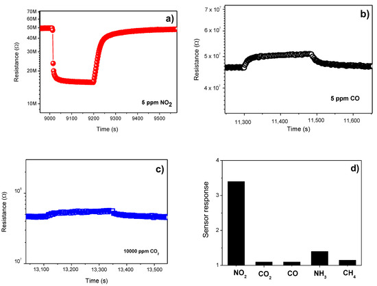 Figure 5a–c displays the response of the sensor to these target gases. As can be seen, the α-Fe2O3 sensor exhibits a high sensitivity regarding NO2. Instead, for CO and CO2, the sensor sensitivity is too low. Figure 5d shows the bar chart of selectivity of the sensor. Responses to other gases, i.e., NH3 and methane, are also added. Tests revealed that the sensor response to 5 ppm NO2 was higher than that of other gases. One can conclude that the α-Fe2O3-based sensor has a good selectivity to NO2 gas. This finding is in agreement with the results of Navale et al. [22]. They have exposed the α-Fe2O3-based sensor to different gases, such as NO2, H2S, CH3OH, C2H5OH, and NH3, and noticed the large response to NO2 with respect to other gases. This remarkable selectivity of the α-Fe2O3-based sensor may be due to the high affinity of NO2 for hematite at the operating temperature of the sensor.
