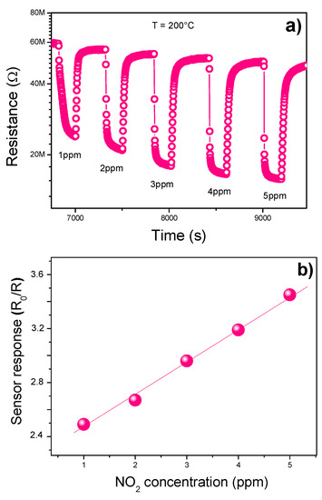 In the investigated concentration range, the sensitivity varies almost linearly with the gas concentration, as shown in Figure 6b. As can be seen, the sensor remains highly sensitive to a low concentration of gas up to 1 ppm, suggesting that it is able to detect lower NO2 concentrations (in the ppb range) so as to be indicated for the sensing of nitrogen dioxide in the environment [3].