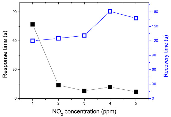The response and recovery times of the α-Fe2O3 sensor as a function of NO2 concentrations at the operating temperature of 200 °C are presented in Figure 7. The measured response times and recovery times are fast. The response time is reduced from 72 to 10 s with increasing the gas concentration from 1 to 5 ppm, this variation is due to the increase in the gas adsorption with the concentration. However, the recovery time, which depends on the gas desorption kinetic, has a reverse behavior: it increases from 8 to 180 s with the concentration. Navale et al. [22] has observed the same trend in the response and the recovery time variations as a function of NO2 concentration. Recently, Zhang et al. [39] have reported a longer time response of up to 2.6 min at an operating temperature of 125 °C and 4.6 min at an operating temperature at 100 °C. These large response times are mainly due to the gas adsorption kinetic slowing with a reduction in the operating temperature.