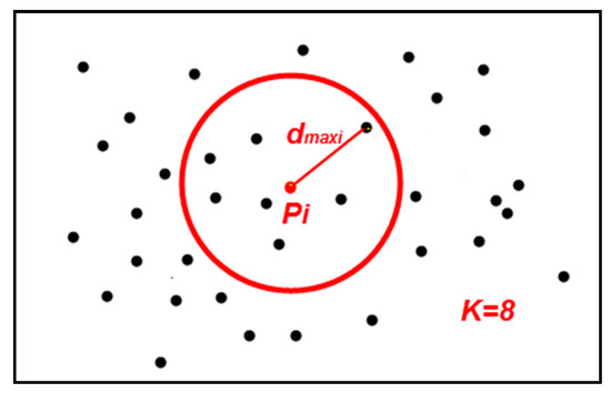 Point cloud P’s KNN mean max distance (): For the point cloud P with points and given k, the point cloud P’s KNN mean max distance can be defined as follows: