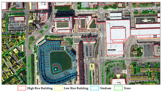 The reference data were collected by the authors for accuracy evaluation based on the LiDAR data using ESRI ArcScene 10.3. The reference data contain trees, street lamps, and buildings, and the numbers are 807, 94, and 18, respectively. Part of the reference data are shown in Figure 14.