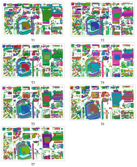 It can be seen from the results graph that in Test T4(ε = 1.14686), most of the buildings, single trees, street lamps, etc., have been divided while some single trees in the row of trees have not been separated. It is because these trees are too close to each other to be segmented. With the increasing of the cluster radius, more street lamps and trees are segmented to one cluster because of under-segmentation. Such as Test T7 (ε = 1.7), only a few single trees have been segmented, most single trees are segmented into a row of trees, at the same time, more street lamps are segmented with trees, as shown in Figure 16, T6, and T7. When the radius is less than the estimated value, such as Test T2 (ε = 0.8), there are only a few single trees or rows of trees, less or no street lamps are segmented. This can be considered as over-segmented.