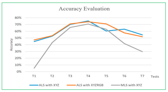 Airborne LiDAR (ALS) and mobile LiDAR (MLS) data with spatial and color information are segmented using the estimated ε and parameters greater and less than ε. The accuracy of each segmentation test is evaluated according to the reference data. The results are shown in Figure 17.