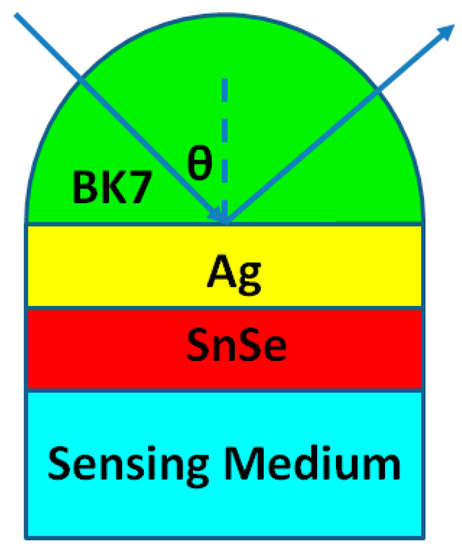 As we know, Au is not susceptible to oxidation and does not react with most chemicals, and hence it is often used as the metal film in sensors. In practical applications, Au films can be replaced by other metals like Ag, which has been found to have higher sensitivity than Au in biosensor applications. However, Ag has poor resistance to oxidation in many environments. In order to protect Ag from oxidation and increase biomolecule adsorption, we introduce SnSe. Additionally, SnSe can also be used as the protective layer adjoined the biomolecular recognition elements to prevent oxidation, increasing the biomolecule adsorption. Therefore, we can use an Ag-SnSe structure to replace the Au film in sensors to obtain new biosensors. In this paper, we have introduced the 2D material SnSe to a type of SPR biochemical sensors to improve their sensitivity and maintain their chemical stability. A Kretschmann attenuated total reflection (ATR) configuration was chosen as these SPR sensor structure. In this structure, a thin metallic silver (Ag) layer was covered on the basis of the optical coupling prism, BK7 glass was used as coupling prism and the Ag layer was separately covered with three types of SnSe allotrope [17,18].