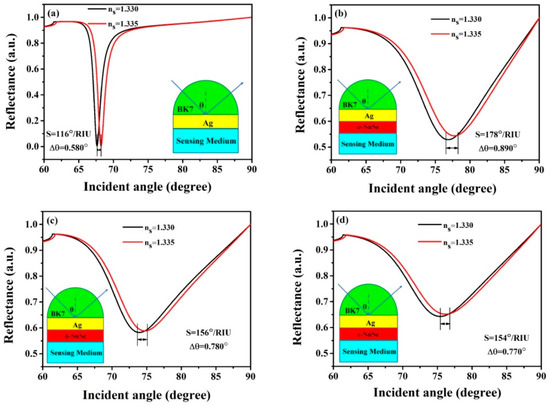 The transformation of sensing medium in refractive index (Δn) can initiate the change of resonance angle (Δθ), and the sensitivity can be indicated as SR1 = Δθ/Δn [24].