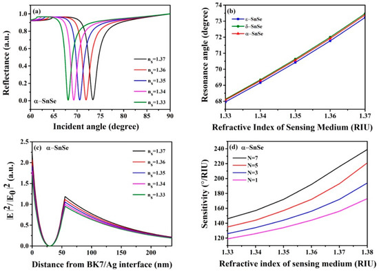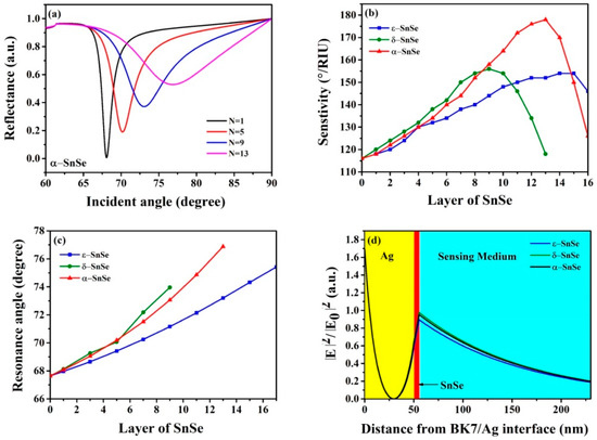 (a) Change of the reflectance of α-SnSe biosensor, (b) variation of sensitivity with respect to different numbers of SnSe allotrope layers, (c) change of resonance angle with respect to different layer numbers of SnSe allotropes, (d) the electric field distribution for the proposed SPR sensor.