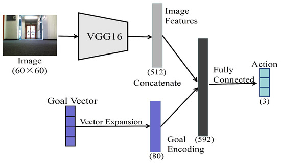 Figure 1 shows the sketch of the network architecture for the goal-directed end-to-end learning. The network takes as input a camera image of size 60 × 60. It extracts from the image a feature vector of length 512, using pre-trained VGG16 without the last fully connected layer [49]. In addition, the goal representation is encoded by a one-hot vector of length 4, which represents the 4 different room types that are potential to be the goal. This is in accord with the number of semantic categories in the experimental area. The vector is then expanded into a vector of length 80 in order to balance the influence of the visual and the goal representation vectors. The visual features and the goal representation vectors are concatenated together as a joint vector, which is then processed by a fully connected network, which uses RELU nonlinearities and 50% dropout, to generate the actions. The action output is encoded by a 3-dimensional vector that represents turning left, moving forward and turning right. Previous works [15,24] have shown that robots with these three discrete actions are able to navigate through a large environment effectively.