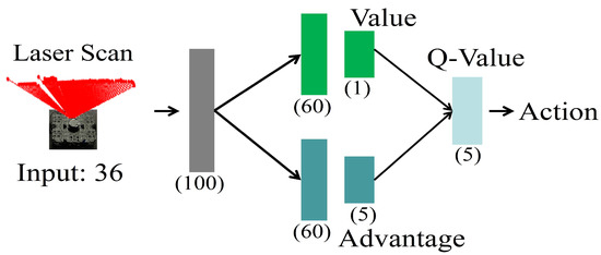 Figure 2. Deep double Q network (D3QN) network structure. Input is a 36-dimensional vector representing the laser range finderings sampled from the raw laser scan between 180 and 180 at 5 degree resolution. The output is a 5-dimensional vector representing the Q-values of the state-action pairs.
