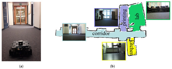 Figure 3. Robot setup and experimental environment. (a) The robot (TurtleBot3 Waffle) in the testing environment. The robot is equipped with a 360 laser distance sensor (LDS) and an Intel RealSense depth camera. (b) A semantic representation of the experiment environment, which is a part of our lab. The colors encode the semantic categories of different places, which include four different room types: a corridor (light blue), a kitchen (yellow), a printing room (purple), and a student lab (green).