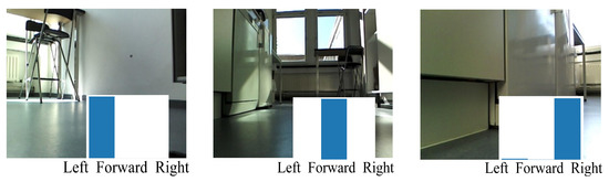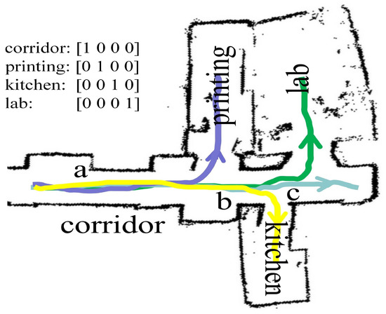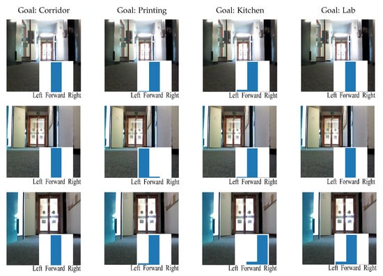 Figure 5 shows the exemplary trajectories predicted by the goal-directed end-to-end network towards different goals in the testing environment. As we can see, the robot could reach the center of the target room or the end of the corridor successfully. In addition, we present the output of the goal-directed end-to-end network at three representative positions in the environment, which are from the area a, b, and c in Figure 5. As shown in Figure 6, given the same camera image at certain positions, the model could generate different actions according to the goal. This confirms the importance of the goal representation in predicting the actions. Notice that the robot’s action space contains no backward movement. In cases when the robot could not navigate to the target room, we required the robot to move forward. For example, when the robot was in position c, it is not possible for the robot to navigate to the printing room whose goal representation is [ 0 , 1 , 0 , 0 ] , it would just move forward, as shown in the sub-image of Figure 6 (the third row, the second column).
