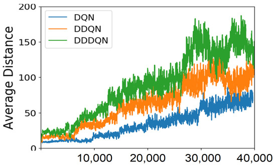 Figure 8 presents the learning result in the Gazebo simulator. As we can see, the moving distance of the robot without collision in each episode keeps increasing as the training continues. This means that the robot is learning well on how to avoid objects. In particular, the performances of two baseline systems: DQN and D-DQN, are presented in comparison with the performance of the adopted learning paradigm: D3QN. The learning results show that the D3QN model outperforms the other two in both the learning speed and performance, which demonstrates the advantages of introducing doubling and dueling techniques for learning.