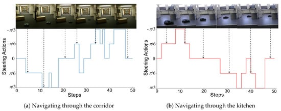 After the trained local planner had demonstrated good performance in the simulator, it was loaded on the WAFFLE robot to test its performance in the real world. We conducted real-world experiments in two different scenarios including a corridor and a kitchen. As shown in Figure 9, we put a rectangular box in the corridor (Figure 9a) and a cylindrical trash bin in the kitchen (Figure 9b). These two objects were not seen during training the global planner. In the experiments, the robot’s objective was to bypass the object in front of it while moving forward. Since the local planner only works on a local scale, we only tested its performance in a relatively small area. While the local planner working, the robot moved with a constant linear velocity (0.03 m/s) and we let the local planner work for a fixed number of 50 steps. This number was chosen based on our experimental experience in our testing area. Figure 9 presents several exemplary trajectories calculated by the local planner during the real-world experiments. In addition, Figure 10 presents the steering actions predicted by the local planner from one of the experiments when the robot was passing these areas. As we can see, the robot can navigate smoothly through these areas. Although the predicted steering actions can be a little bit unstable in the corridor (Figure 9a), the robot is still able to navigate through the narrow space between the box and the wall successfully. Experimental results validate that the D3QN based local planner which was trained in the simulation environment is able to perform object avoidance in the real world.