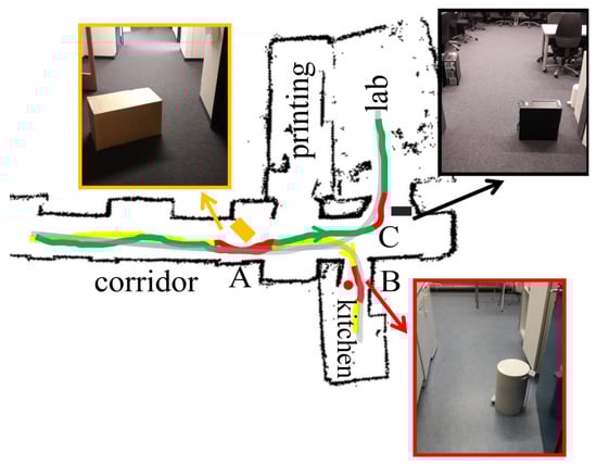 Figure 11. Experiment results of combing the global and local planners. The inset images show the scenes of several newly placed objects in the environment. The green and yellow lines represent the trajectories calculated by the global planner, where the goal of the green one is the student lab and the goal of the yellow one is the kitchen. The red lines represent the trajectories calculated by the local planner which works temporarily to deal with changes in the environment. The light black lines represent the trajectories calculated by the SLAM package.