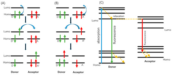 Fluorescence quenching mechanisms. (A) Photo-induced reduction mechanism. (B) Photo-induced oxidation mechanism. (C) Fluorescence resonance energy transfer (FRET) mechanism.