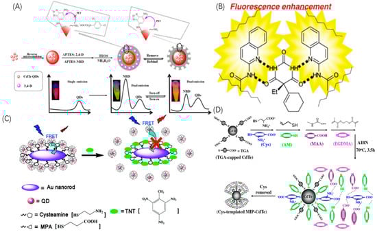 Through the process of fluorescence quenching, the change of QDs’ fluorescence intensity can be detected as an optical signal when MIP bioprobes or biosensors rebind with template molecules. Typically, three mechanisms account for the fluorescence quenching of QDs, where template molecules act as quenchers. The major cause of the QDs quenching is photo-induced electron transfer (PET), which occurs when excited QDs capture excitons offered by template molecules (donor) through photo-induced oxidation, or transfer excitons to the template (acceptor) through photo-induced reduction. By capturing or transferring electrons, QDs relax back to ground state and achieve fluorescence quenching. The mechanism is shown in Figure 2A,B.