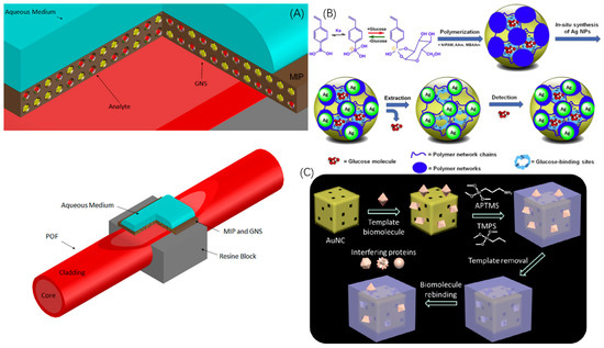 Novel architectures of SPR-MIP bioprobes and biosensors. (A) Schematic representation of the SPR-MIP biosensor with tapered optical fibers and decorated with five-branchedgold nanostars in MIP film. (B) Schematic illustration of SPR-MIP bioprobes for glucose with Ag NPs surrounded by poly(NIPAM-AAm-VPBA) to form the microgel which control the distance of Ag NPs with each other and ensure them to display SPR property. (C) Schematic representation of QDs-MIP gold nanocages, (A is reproduced with permission from [47], B is reproduced with permission from [49], C is reproduced with permission from [50]).