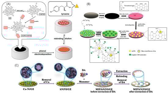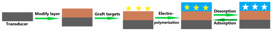 Electrochemical sensing is the most widely used sensing method for all sorts of biosensors, MIP biosensors are without exception, and because of the sensitivity of MIP and the sensibility of the electrochemical sensing method, they have attracted considerable attention to the efforts to combine MIPs with electrochemical sensing to build electrochemical-MIP-biosensors [65,66]. In a standard structure, a MIP nanofilm is polymerized through electrochemical or chemical methods and immobilized on the electrode to fabricate a sandwich-like assembly. The process of producing electrochemical-MIP biosensors is shown in Figure 6. Electrochemical sensing is directly based on the electrochemical signals produced in the sensing process of redox reaction between template molecules and modifiers on the working electrode or the electrode itself, namely the electron transportation of redox reaction. Detailed information about electrochemical sensing with MIP biosensors is summarized in Table 2.