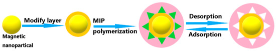 As a powerful molecular synthetic strategy, molecular imprinting technology (MIT) has been studied since first presented by Wulff [1] 40 years ago. It has come a long way in recent decades as a technique in a broad range of solid phase extraction, chemical reaction catalysis, membrane separation or chromatographic separation, biosensing and cell recognition applications [2,3,4,5]. The molecular imprinting process is straightforward, typically involving the copolymerization of a functional monomer or a series of functional monomers, a cross-linker, and an initiator in the presence of template molecules, whereby the functional monomer possesses special functional groups to bind with the template molecules. After polymerization, the resulting molecularly imprinted polymers (MIPs) have stabilized binding moieties and subsequent removal of the template molecules leaves a cavity with complementary size, shape and chemical moieties to the template and facilitates the capture of analytes by the MIP [6,7,8,9]. A schematic of the whole process is shown in Figure 1.
