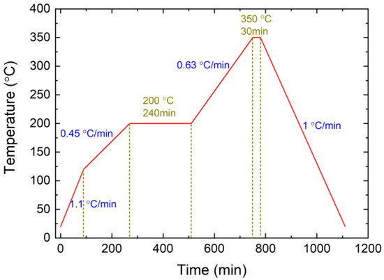 An EPA model was constructed from sealing glass, a steel shell, and a Kovar conductor, the same as was used in a real EPA in a nuclear power plant. The outer and inner diameters of the steel shell were 5 mm and 3.5 mm, and those of the sealing glass were 3.5 mm and 2.5 mm, respectively. The diameter of the Kovar conductor was 2.5 mm. The material of the steel shell was 316 stainless steel. The Kovar conductor was constructed from Kovar alloy. The sealing material was a low-melting-point glass. First, the granulated glass powder was formed into a cylinder with a central path for the Kovar conductor and axial paths for the penetration of the FBG. Subsequently, the glass cylinders were sintered after the heating process shown in Figure 2.