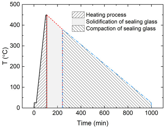The sealing process of the glass in the EPA was divided into three stages: heating, solidification and compaction, as illustrated in Figure 4. Through measurement of temperature and residual stress, heating, and compaction during the sealing process could be studied.