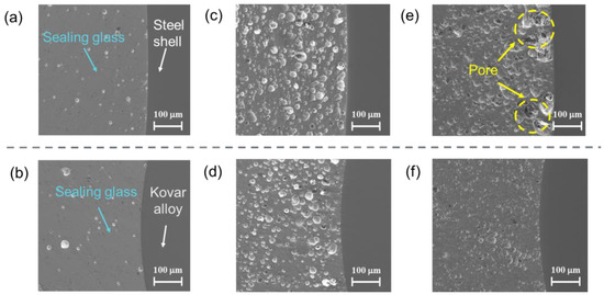 Microstructure of (a) sealing glass and steel shell with 450 °C EPA, (b) sealing glass and Kovar conductor with 450 °C EPA, (c) sealing glass and steel shell of 470 °C EPA, (d) sealing glass and Kovar conductor of 470 °C EPA; (e) microstructure of sealing glass and steel shell of 490 °C EPA; and, (f) microstructure of sealing glass and Kovar conductor of 490 °C EPA.
