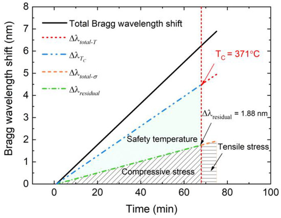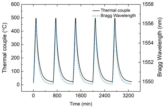 A five-cycle reheating test was carried out after the EPA sealing process, and the Bragg wavelength curve is shown in Figure 10. Wavelength changes were almost the same during the five-cycle test, which means that the sealing structure was not destroyed and the results are reliable. The mean value of the Bragg wavelength shift Δλtotal of the five reheating tests was about 6.85 nm. The Bragg wavelength shift Δλtotal-T caused by temperature rising from 25 °C to 400 °C was calculated based on the results of the temperature measurement test, and the value was about 4.95 nm. The Bragg wavelength shift that was caused by changes in stress Δλtotal-σ was obtained by subtracting Δλtotal from Δλtotal-T, which was about 1.9 nm. Given that stress changed linearly with rising temperature, the relationship between Bragg wavelength shift caused by stress and temperature can be summarized by Equation (4).