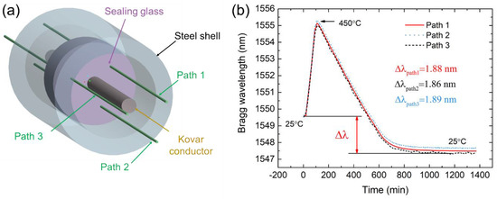 Due to the limited size of sealing glass in an EPA (2 mm thickness), the traditional strain gauge is not suitable, and many other measurement tools have limitations under this circumstance. Optical fiber sensing techniques have been applied to measure different parameters [5,6,7,8,9,10] (strain, temperature, deformation, humidity, etc.) and to simultaneously monitor multiple parameters [11,12,13,14] in many fields, such as aerospace engineering [15,16] and the power industry [17,18,19]. These techniques have shown better performance in comparison with conventional sensors. Optical fiber sensors have been chosen to monitor axial stress in sealing glass for two reasons. One is that fiber has a small diameter (about 0.1 mm), and hence it would not have an adverse effect on the compact structure. The other reason is that both fiber sensors and sealing glass have similar chemical contents, which allows them to easily bond together to precisely monitor sealing glass without affecting insulation or hermeticity. When compared with other optical fiber sensors, fiber Bragg grating (FBG) sensors have unique advantages, such as being easy to embed in the tested object, mature inscribing techniques, and are more suitable for strain measurement at high temperatures.