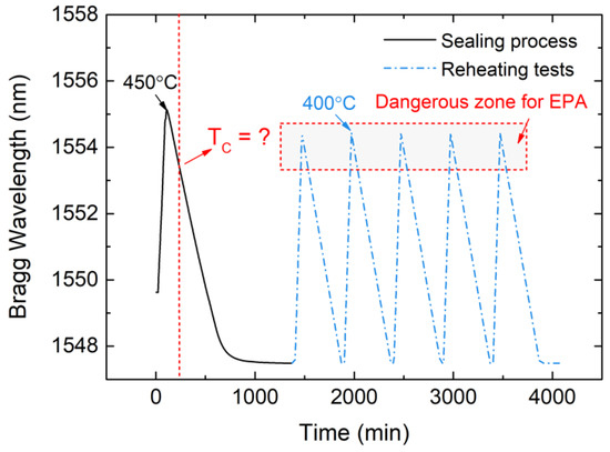 The cure temperature of this low-melting-point glass was a certain value, Tc, below 400 °C, which meant that, if the sealing glass was reheated to Tc, the residual stress would disappear and the Bragg wavelength shift should be 1.88 nm, as measured by the 5 mm FBG sensor. Similarly, if the sealing glass was reheated to 400 °C, then the residual stress would transition from compressive stress to tensile stress, and the wavelength shift would be larger than 1.88 nm. Based on that, the cure temperature could be obtained by the reheating test.