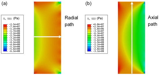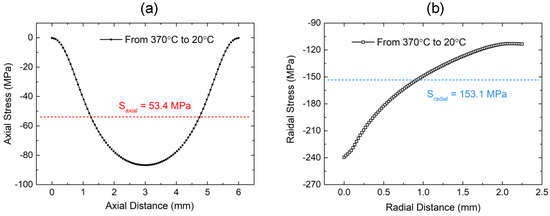 (a) Axial stress and (b) radial stress distribution in the sealing glass after the sealing process.