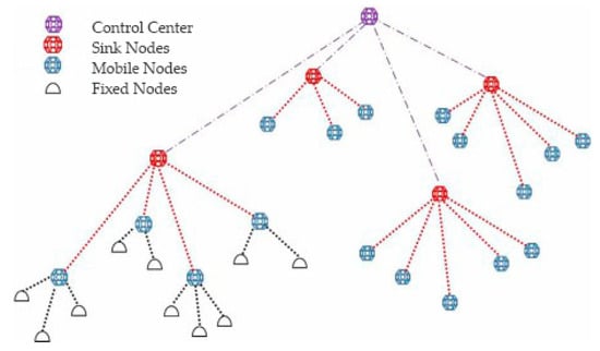 As shown in Figure 1 [], the network topology of the OA-UWSN is composed of fixed nodes, mobile nodes, sink nodes, and control centers. The fixed nodes are deployed on the sea floor to collect monitoring data (such as temperature, salinity, and depth), images, or videos. The mobile nodes are suspended in the sea, completing the data collection and passing the data to the upper mobile nodes or the sink nodes and then to the control centers. Sink nodes and control centers are deployed in the sea and receive the collected information and send it to remote terminals.
