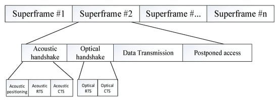 In this paper, combined with the postponed access mechanism in the CSMA/CA data link layer access method, a spatial multiplexing-based spatial division multiple access is introduced, making full use of the directional transmission characteristics of light to increase the data transmission distance. Figure 2 shows a superframe structure designed for the OA-UWSN in this paper. The protocol divides a superframe into different periods: An acoustic handshake period, an optical handshake period, a data transmission period, and a postponed access period.