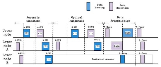 This paper combines the advantages of both optical and acoustic communication modes and proposes an OA-CMAC communication mechanism. How node A and node B of the lower layers transmit data to the upper node is illustrated as an example to describe the data sending, receiving, and confirming mechanisms. As shown in Figure 3, the specific steps are as follows: