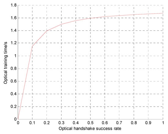 The upper limit of the optical handshaking time can be obtained by deriving Equation (4). Table 1 lists the parameter settings for the simulation in Equation (4). Figure 4 shows the relationship between the upper limit of the optical handshake time and the optical handshake success rate.