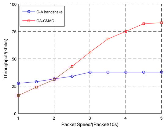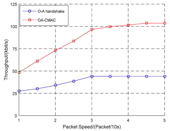 According to the difference in the optical handshaking success rate, this work simulated the relationship between the packet sending rate and the throughput of the OA-CMAC protocol and compared it to the OA-MAC protocols, as shown in Figure 5, Figure 6 and Figure 7.