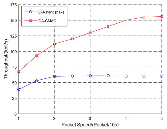 In Figure 7, where the optical handshaking success rate was 80%, even if the packet transmission rate was low, the throughput of the OA-CMAC protocol was higher than the other two protocols because optical communication could perform high-speed and large-capacity data transmission.